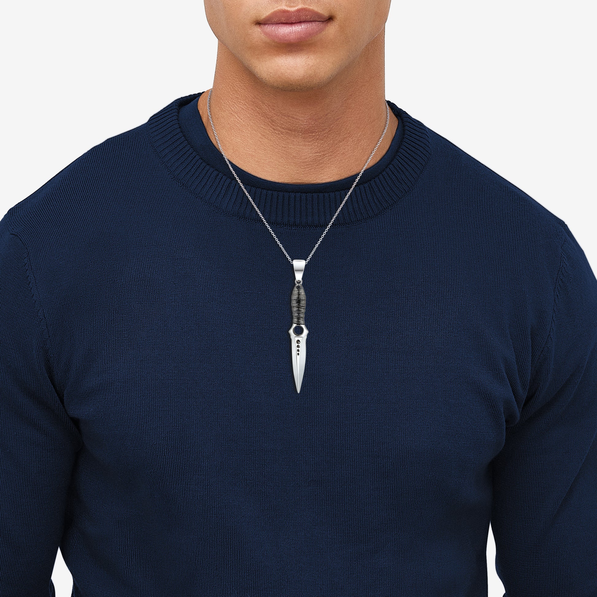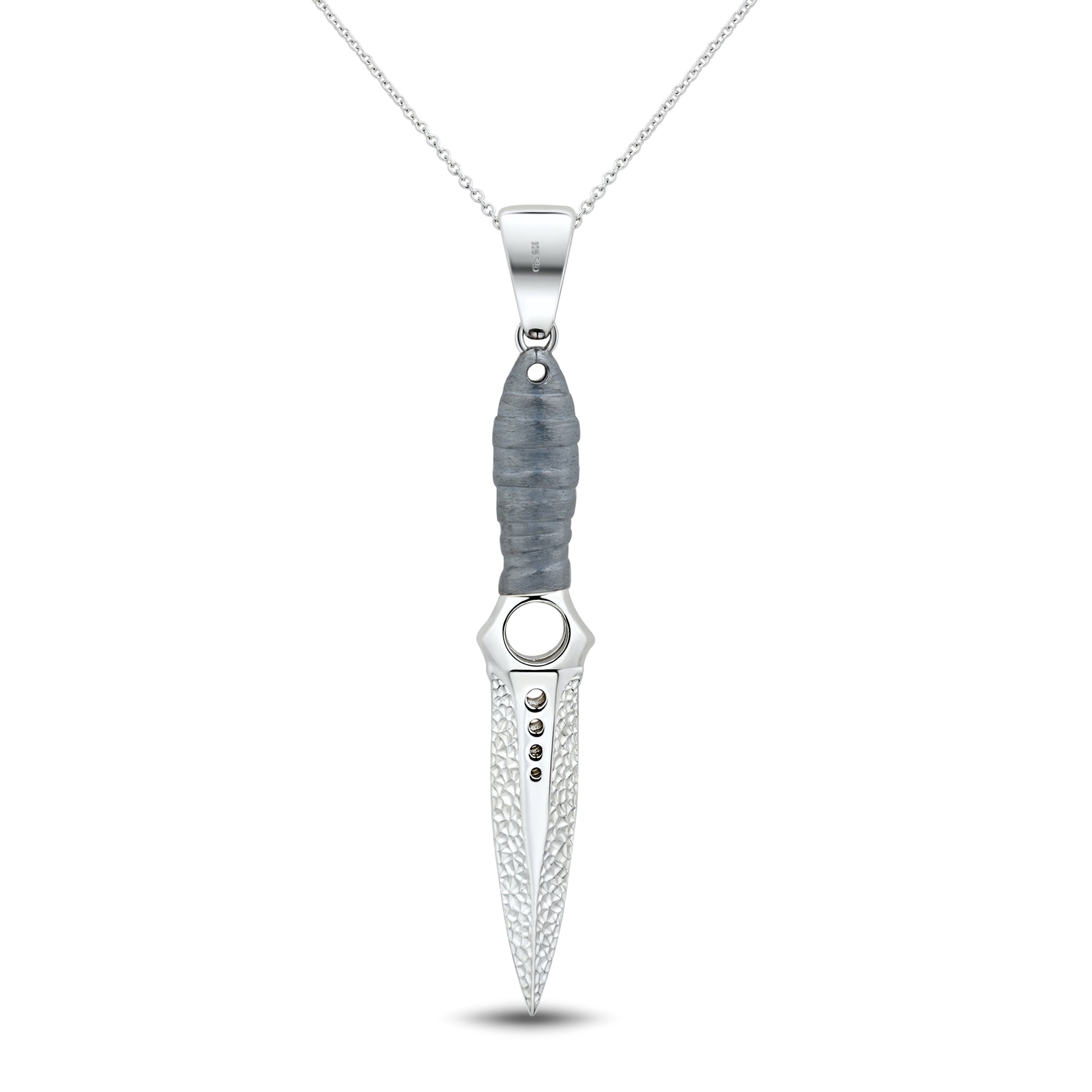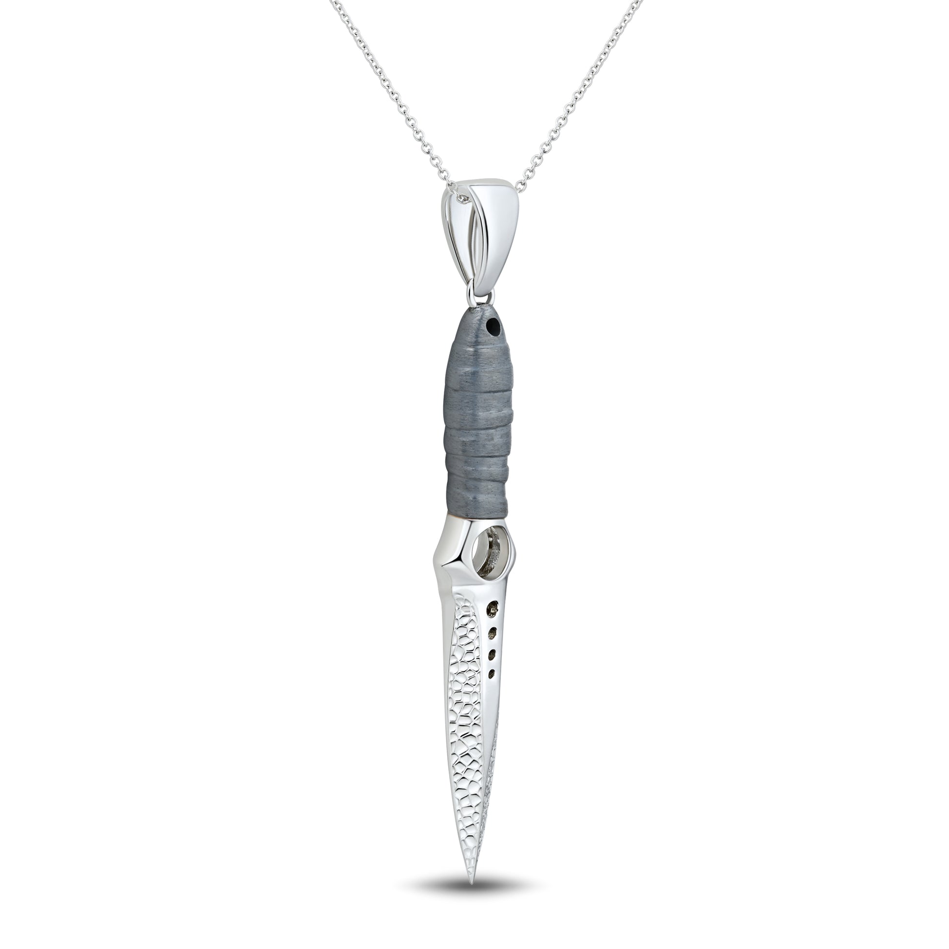 Skeleton sterling silver knife pendant with brushed gunmetal handle finish and hammered blade.