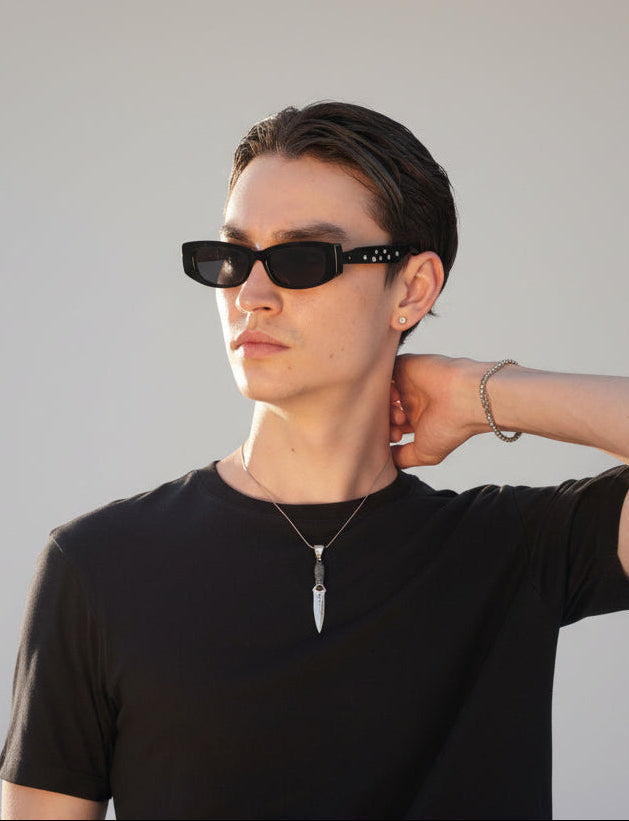 Skeleton sterling silver pendant with gunmetal brushed handle finish and high polished blade.